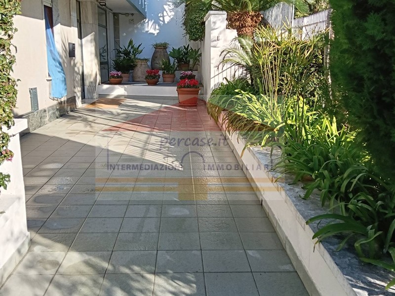 Appartamento in palazzo signorile in zona residenziale tranquilla, a circa 600 metri dal mare con ampio giradino in uso esclusivo: ingresso in disimpegno, cucina, ampio salone, camera letto matrimoniale, bagno, seconda camera con bagno, giardino piantumato ad uso esclusivo. Garage e cantina. Comodo al centro, ai principali servizi, al mare ed alla pista ciclabile raggiungibili in pochi minuti a piedi.Servizio di portineria. Mq catastali 104, escluso il giardino. Ape Classe E, Ep 104,85 kWh/m2