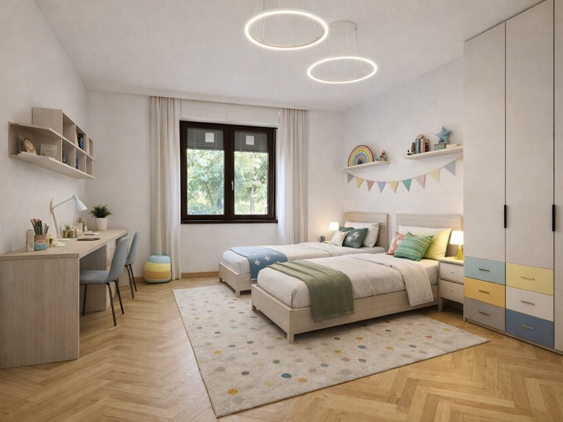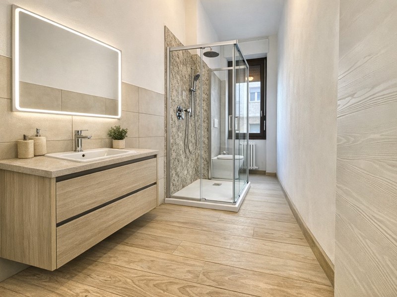 - Impianti, pavimenti( grès zona giorno e servizi, parquet rovere con posa lisca di pesce italiana camere) e bagni,