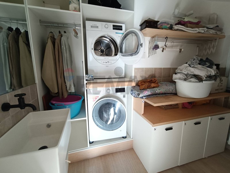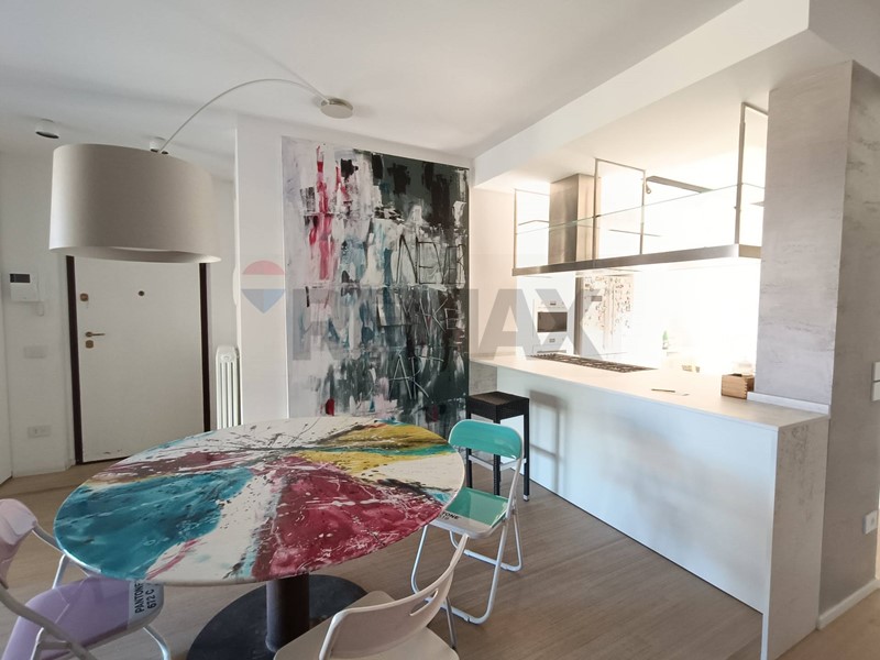 L'appartamento è composto da un ampio luminoso soggiorno, una cucina abitabile aperta a vista sul soggiorno, una camera da letto matrimoniale e un bagno completo di tutti i servizi, con doccia e finestra. A completamento della cucina c'è una lavanderia/stireria/ripostiglio dove è alloggiata la lavatrice.
