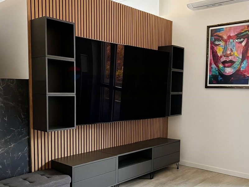 Varcando la porta dingresso, si apre un open space luminoso dove cucina a vista con isola e zona living dialogano armoniosamente, creando un ambiente accogliente e moderno. Una parete attrezzata cela un elegante studio: un angolo intimo e riservato, nascosto con gusto.