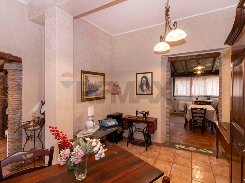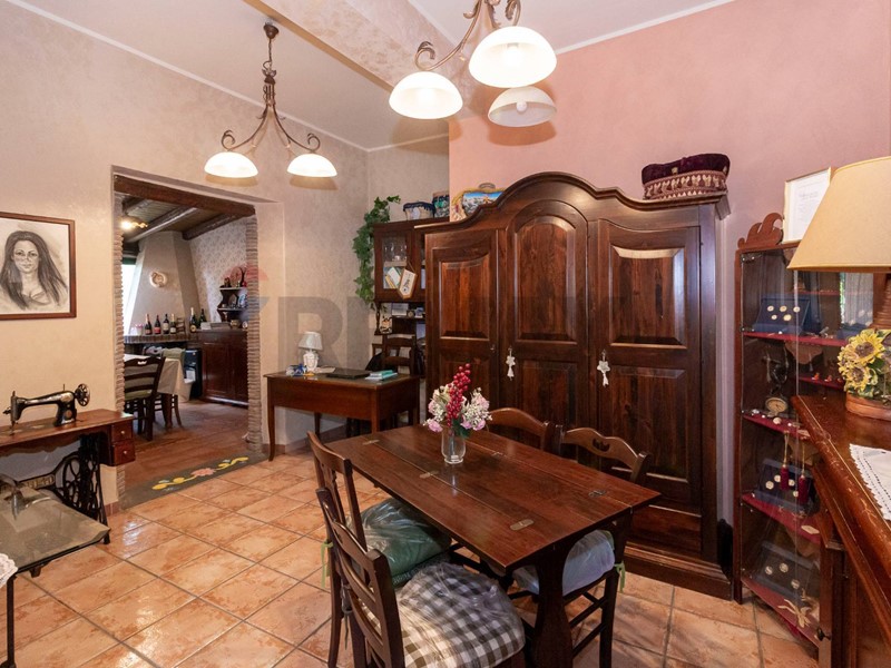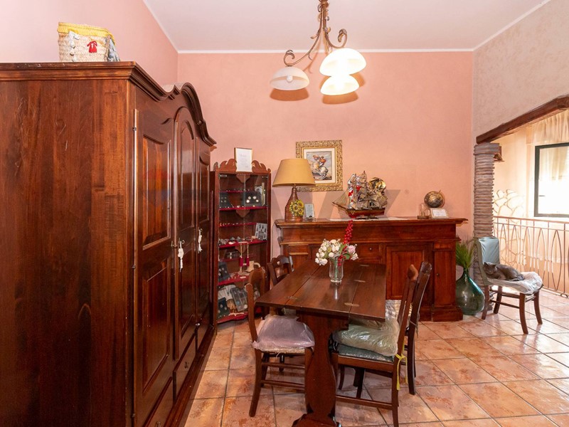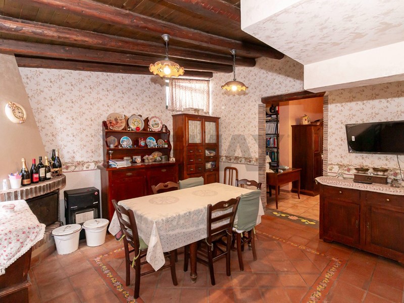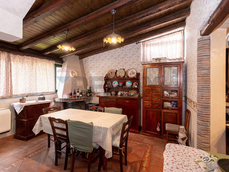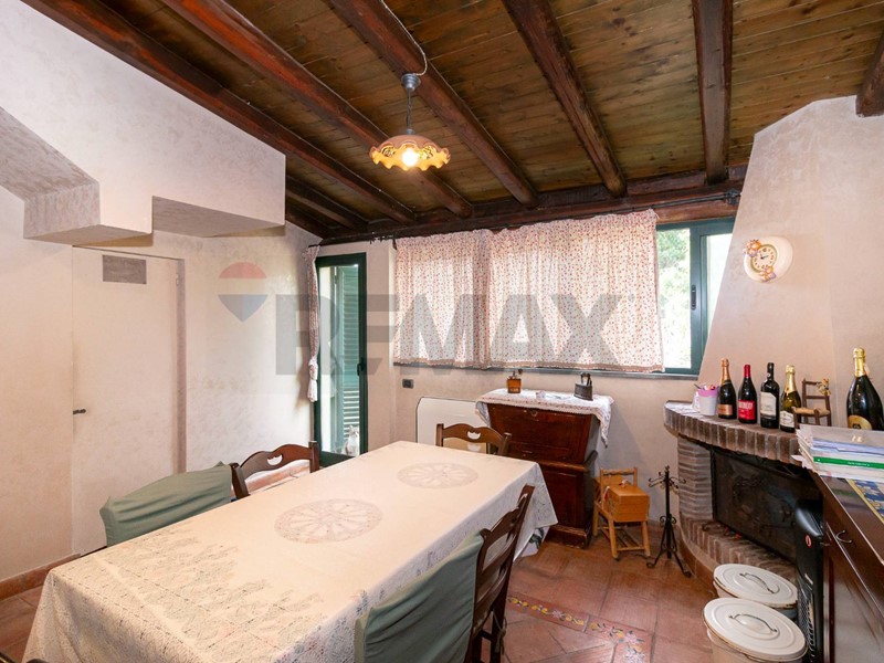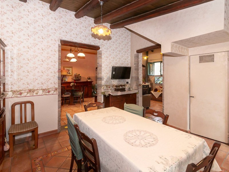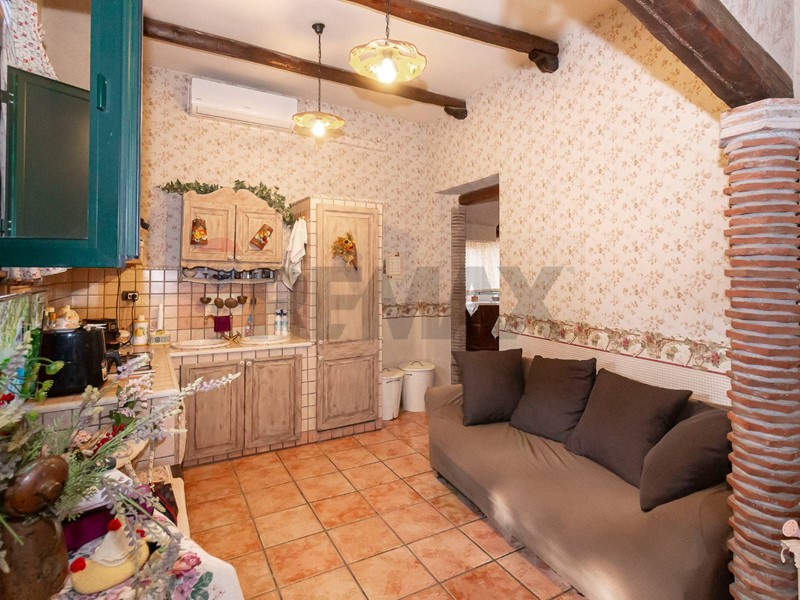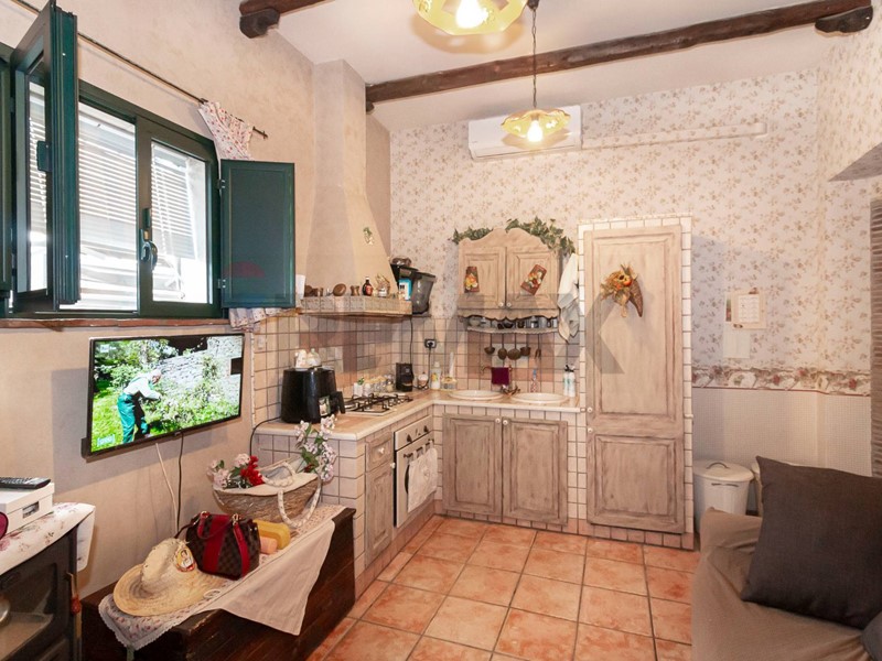 Ingresso su ampia cucina in muratura open space con salone dotato di camino, termoconvettore e climatizzatore.