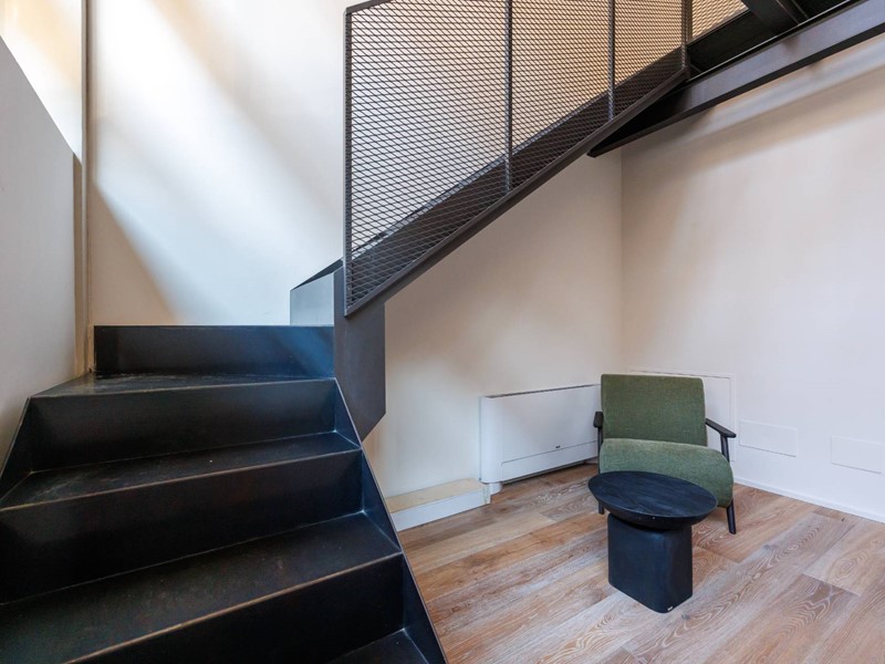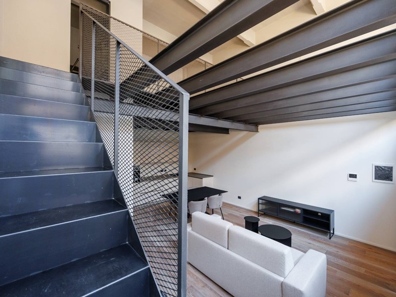Dal piano terra si accede al piano soppalcato, mediante scala interna in acciaio e legno, dove troviamo unampia zona notte.