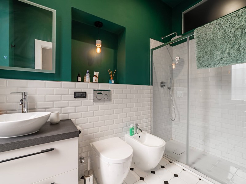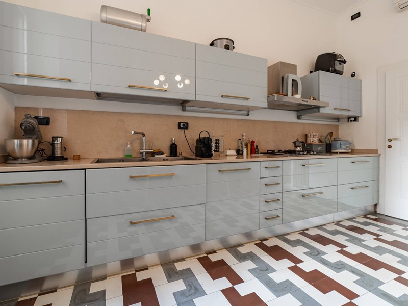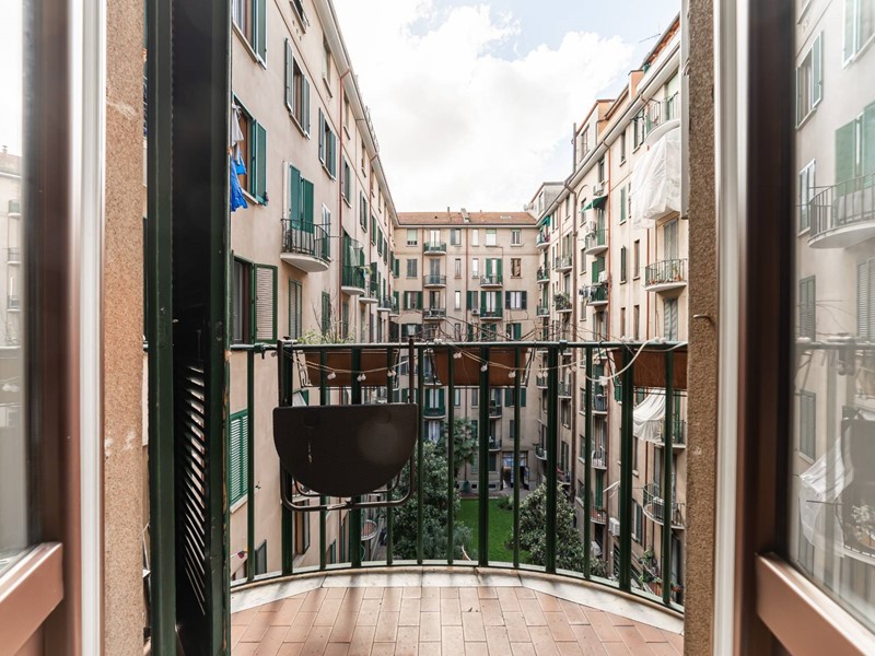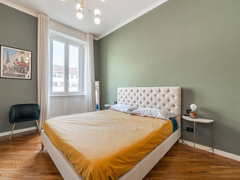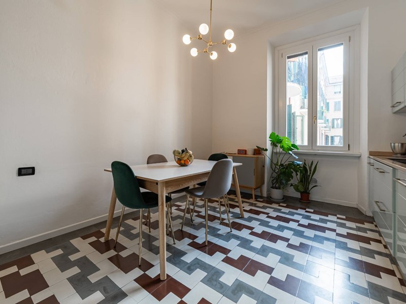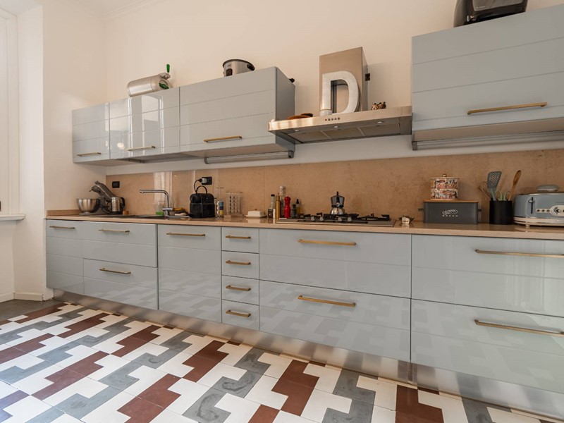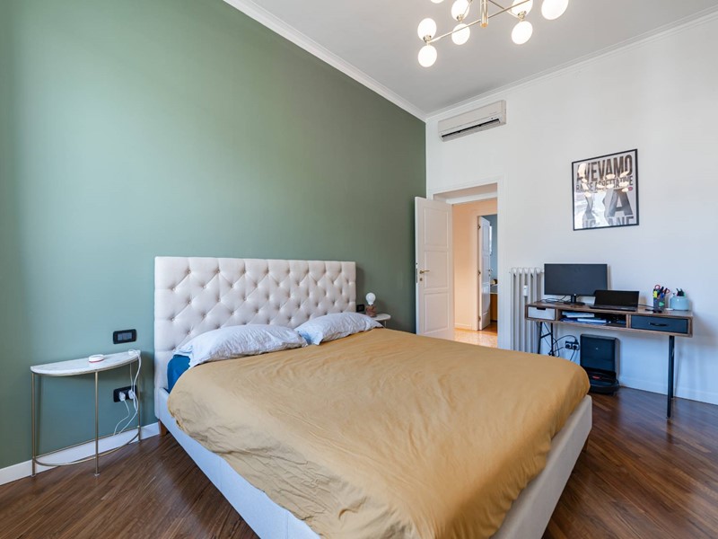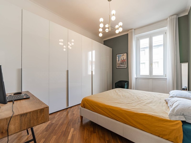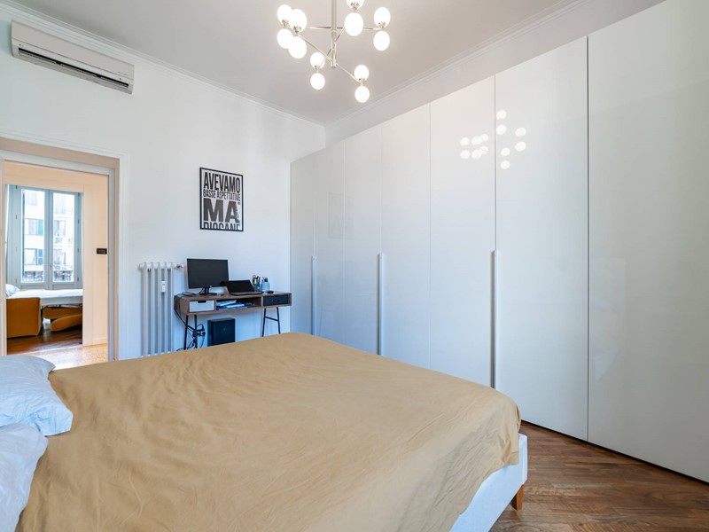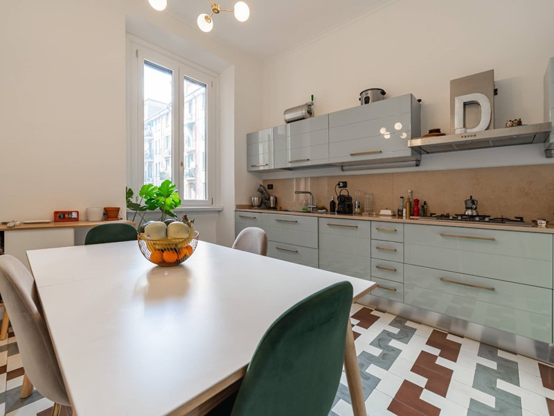 L'ingresso, con armadiature su misura è caratterizzato da una pavimentazione a "cementina milanese" e da una raffinata carta da parati, conduce all'ampio salone con affaccio su strada privata e grandi porte finestre che donano una bella luce all'ambiente; frontalmente troviamo la grande cucina abitabile con elettrodomestici a incasso e pavimento originale sapientemente restaurato. L'abitazione ha due camere da letto di cui una con bagno en suite, ampia portafinestra su balconcino rotondo. La seconda camera da letto si affaccia su una silenziosa strada privata ed è caratterizzata da un'ampia armadiatura su misura. A parte un secondo bagno.