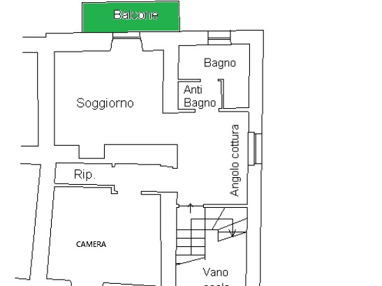 L'appartamento è al primo piano ed è composto da : ingresso, cucinotto, salotto con balcone, bagno, ripostiglio.
