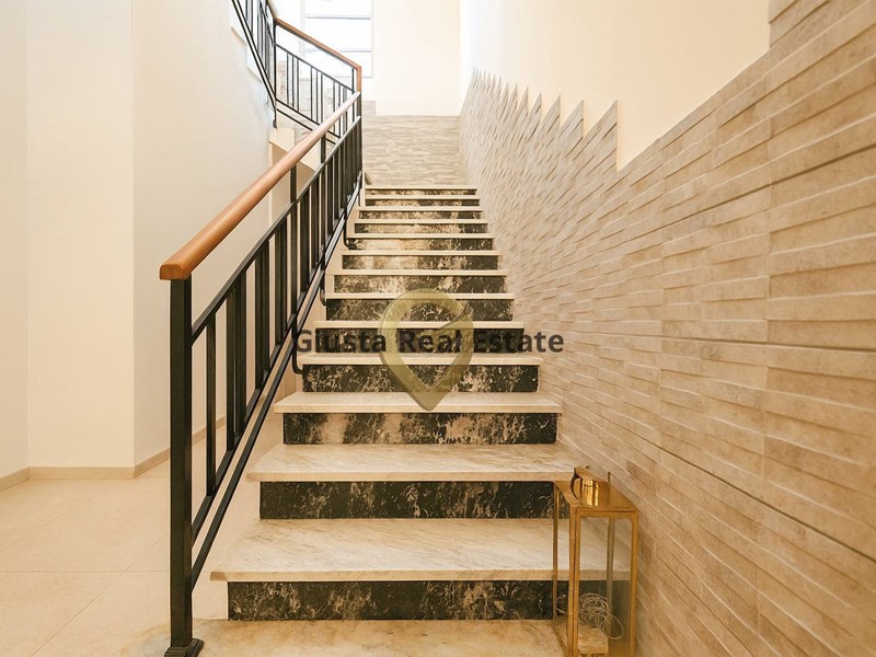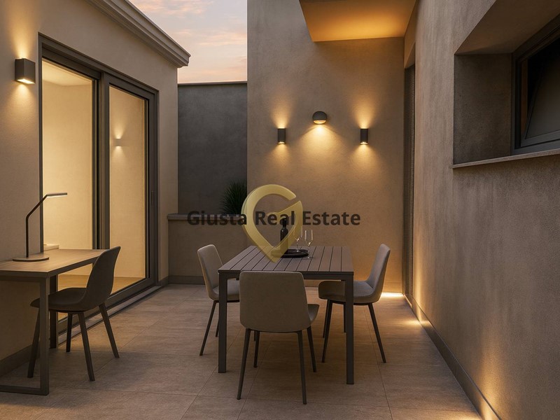 La zona giorno ospita un luminoso salone e una cucina con accesso diretto al terrazzino a livello, perfetto per colazioni o pranzi allaperto.