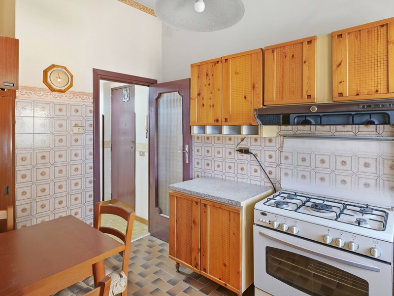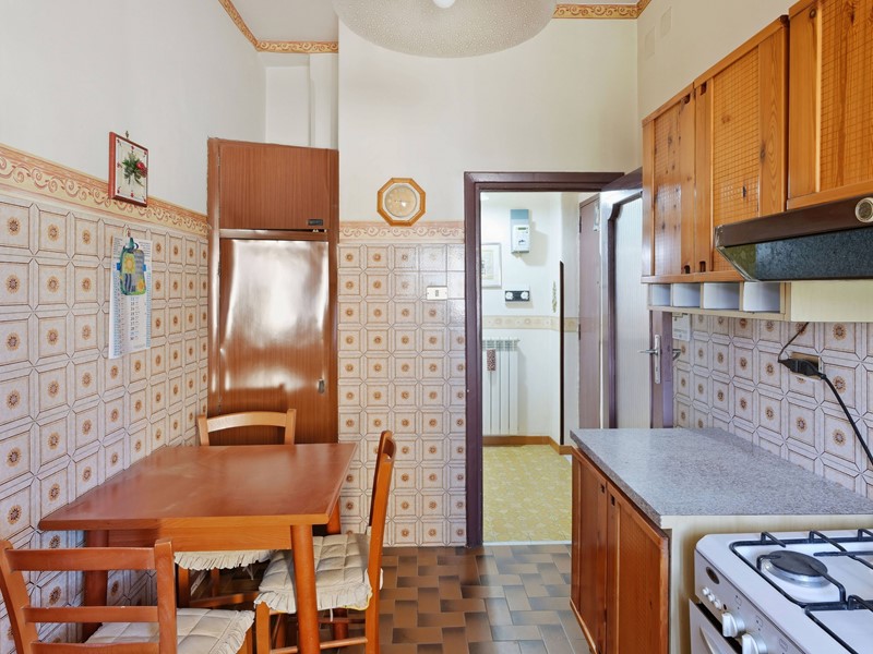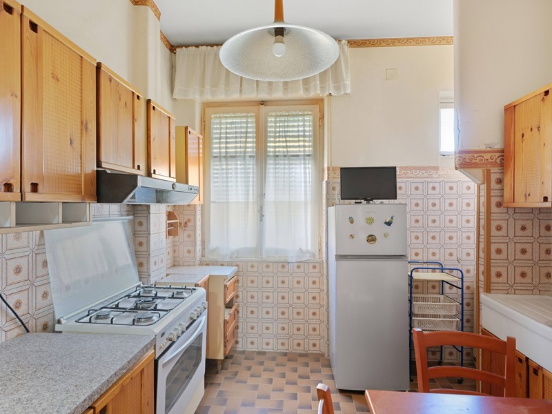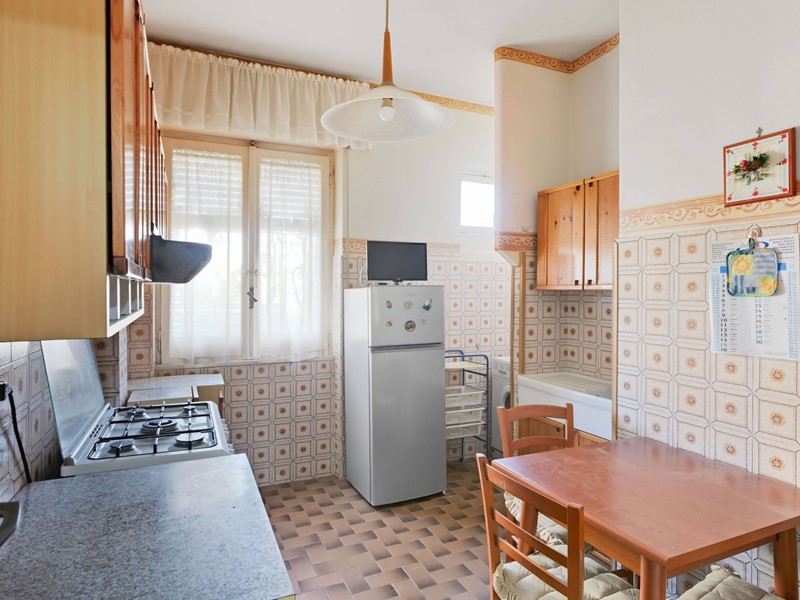 Sul lato opposto troviamo una cucina abitabile, silenziosa e luminosa, anchessa con affaccio sul verde.