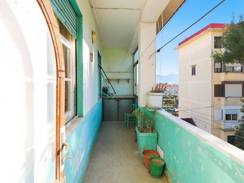 Lingresso introduce in un disimpegno funzionale che accompagna verso un salone luminosissimo, impreziosito da un doppio punto luce. Da qui si accede a un balcone generoso e soleggiato, con affaccio interno sul parco, da cui lo sguardo si perde tra il mare allorizzonte, il campanile della Chiesa della Madonna del Carmine e la silhouette inconfondibile del Vesuvio: un panorama che regala fascino e serenità ogni giorno.