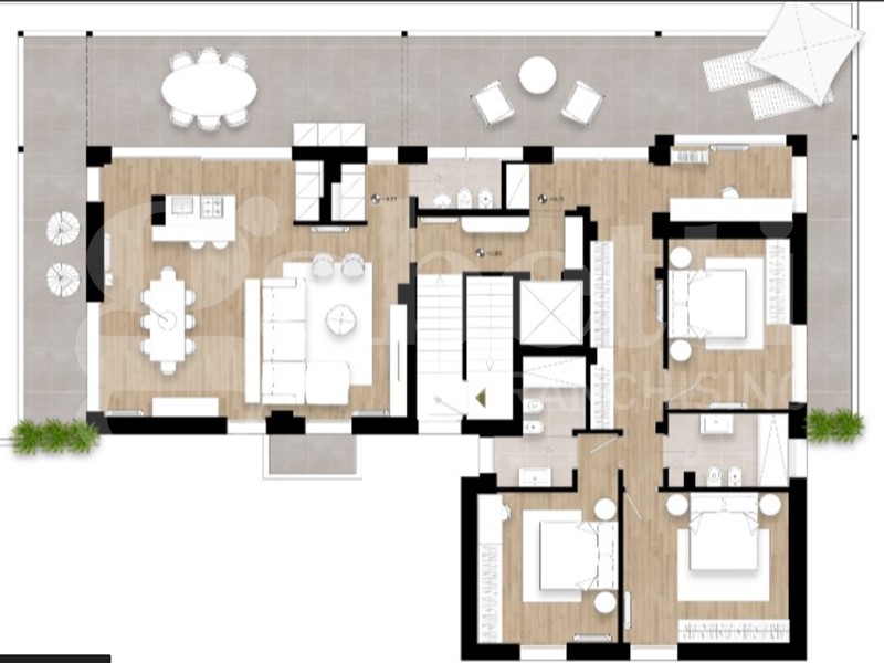 Troviamo poi le tre camere da letto e tre bagni di cui uno ceco.