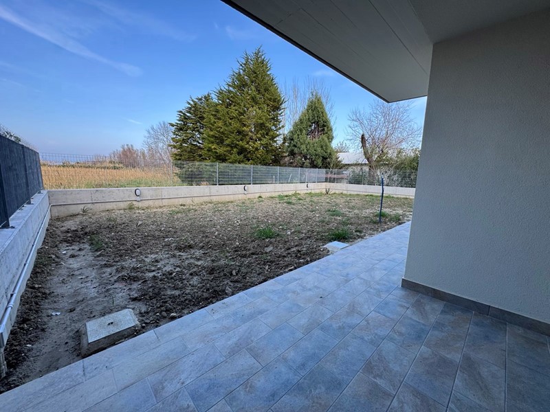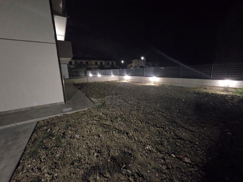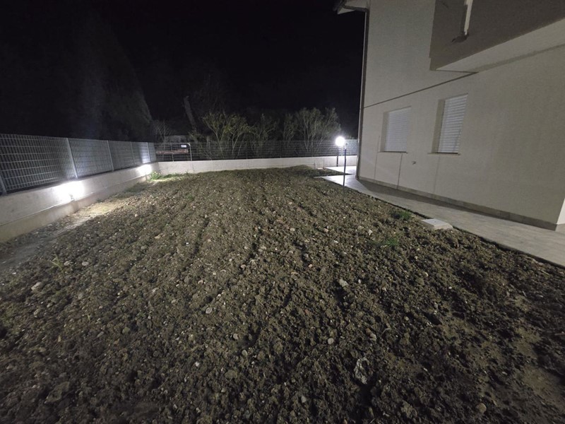 Il punto forte di questa soluzione è sicuramente lo spazio esterno (di circa 145 mq), che gira intorno alla soluzione, in parte a giardino ed in parte pavimentato e con l'ingresso per l'auto.