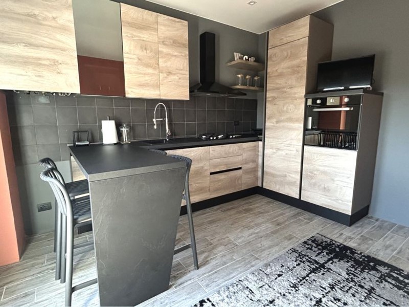 Zona giorno open space con splendida cucina scura a vista di colore legno in un mix perfetto di armonia, gusto e design. Isola per colazioni e pranzi.