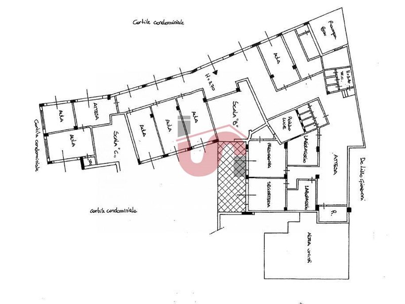 L'immobile è composto da un grande piano terra con 3 lati che affacciano nel cortile interno del complesso edilizio che lo ospita e dai quali prende accesso indipendente, dove peraltro sono ubicate anche le 8 vetrine. La Struttura dispone di ulteriori uscite di sicurezza dotate di maniglione antipanico ed internamente si divide in n. 7 vani, n. 2 uffici, n. 2 laboratori, 4 wc ed un locale deposito.