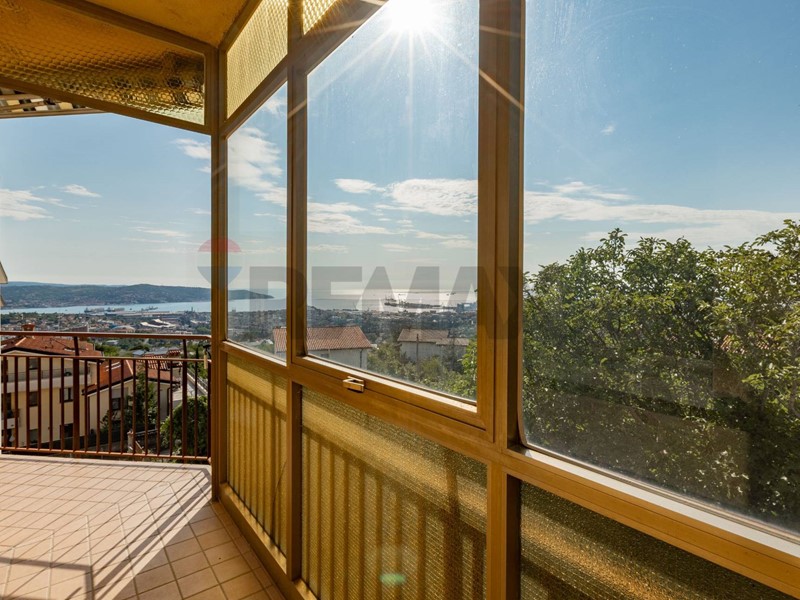 Internamente lappartamento, dotato di porta blindata, è composto da un corridoio di ingresso dal quale è possibile accedere alle due camere matrimoniali, al bagno completo e finestrato e alla zona giorno composta da cucina separata e da un salone con balcone ad angolo parzialmente verandato con spettacolare vista panoramica su tutto il Golfo di Trieste.