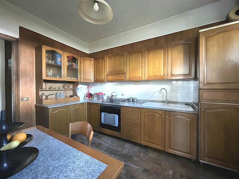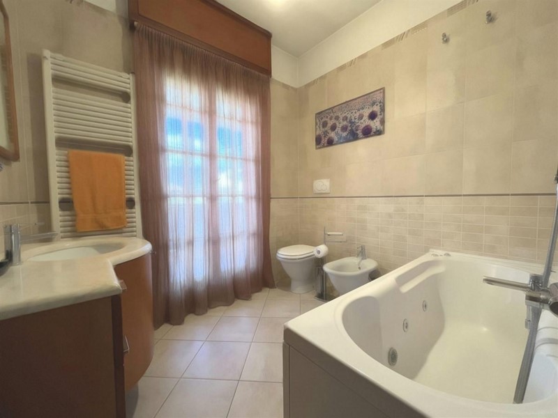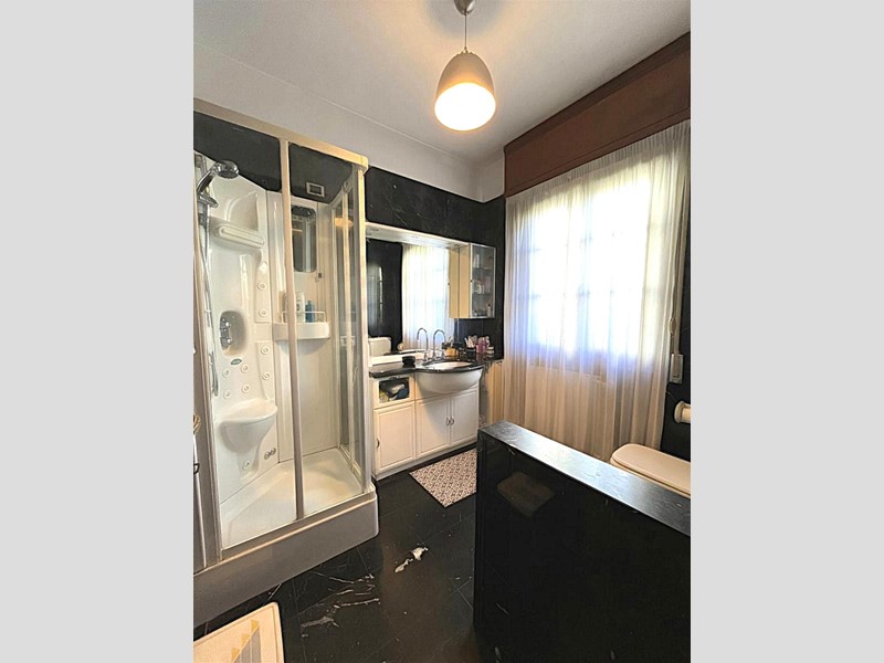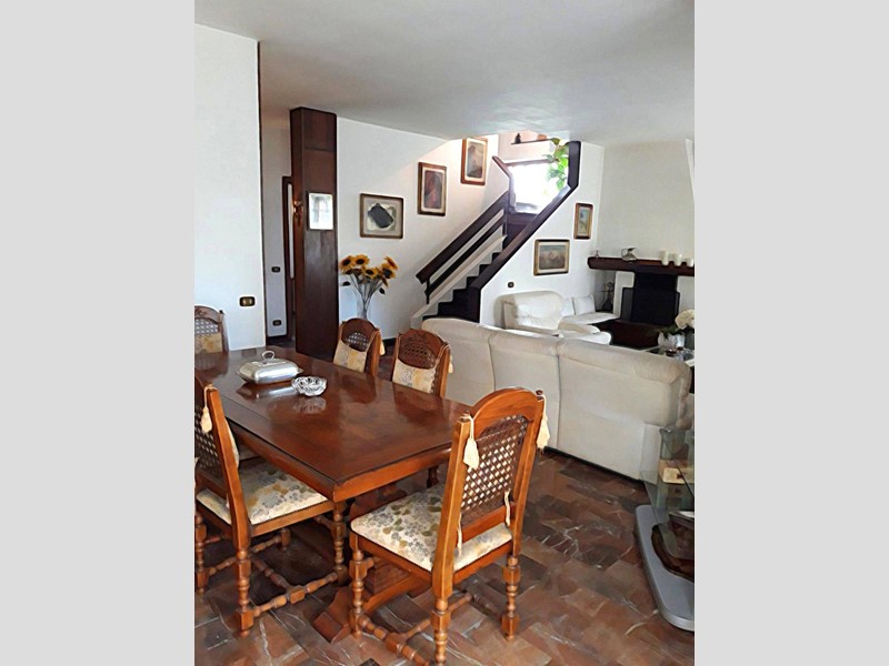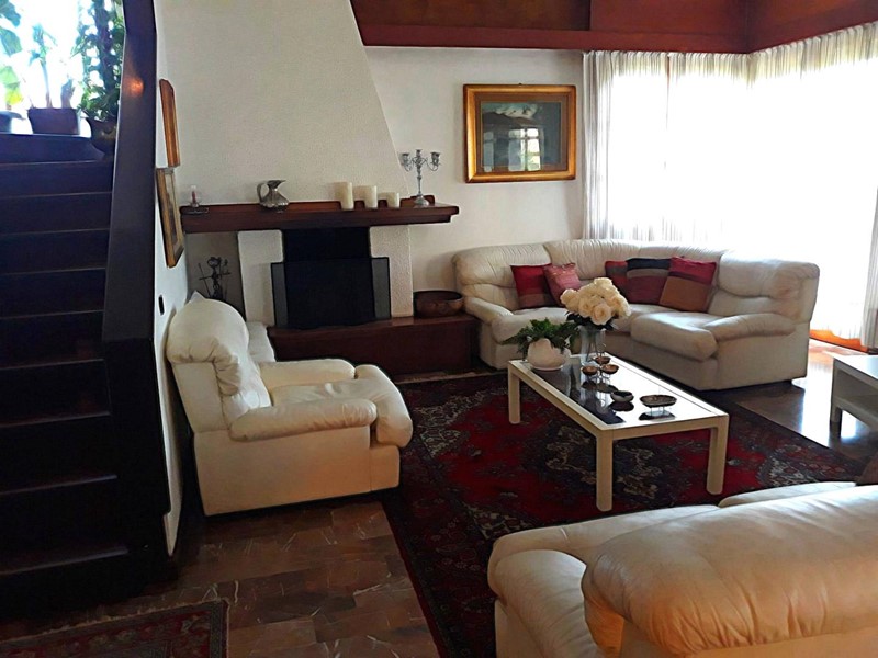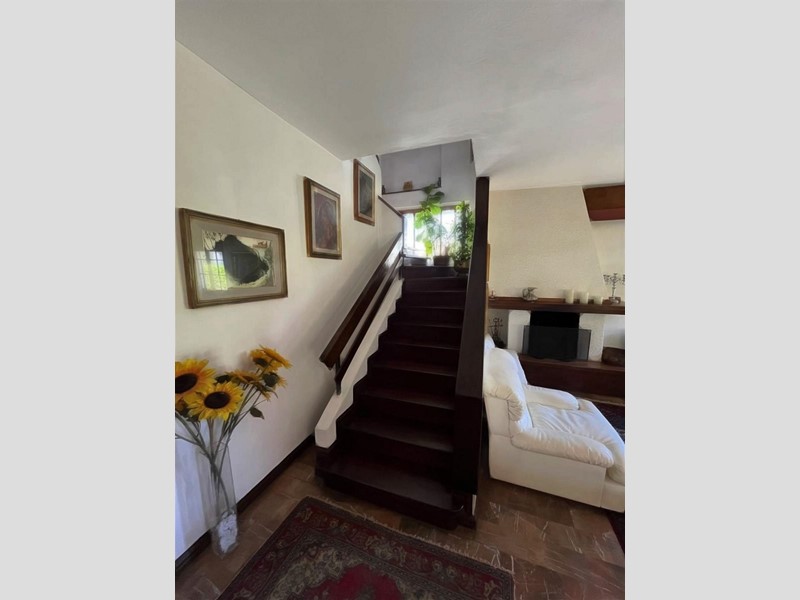 Al piano superiore un luminoso disimpegno consente l'accesso alle quattro camere da letto e ai due bagni. Sono presenti ben quattro terrazze nella zona notte. Il piano semi interrato è accessibile sia dall'interno della casa che da scala esterna ed è diviso in tre locali uso cantina ed una lavanderia. All'esterno la proprietà possiede una zona dedicata al parcheggio di più automobili ed una zona a giardino.
