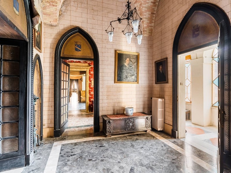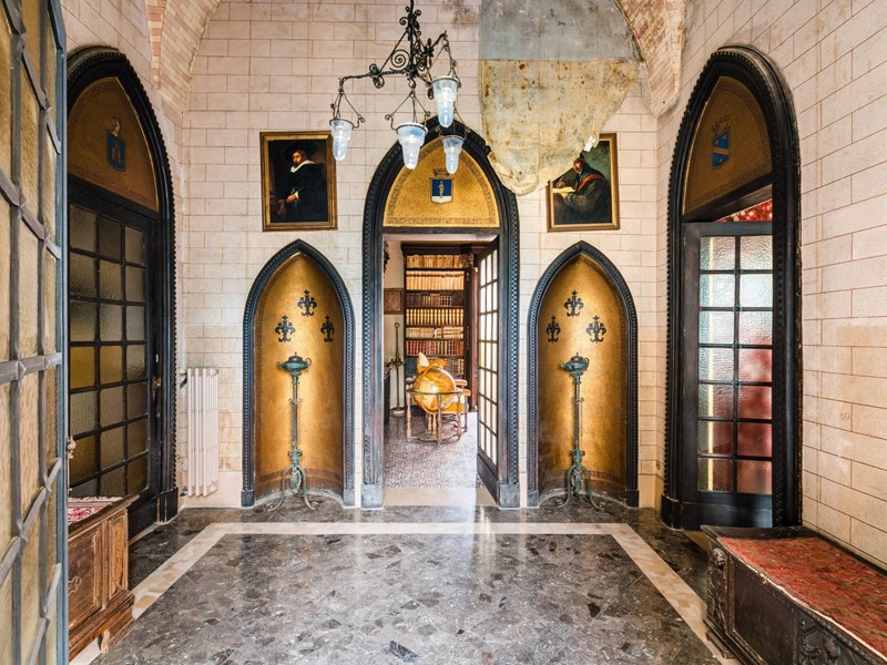 Salendo l'antica scala in pietra, si accede al piano nobile di 995mq, accolti da una scenografia neogotica dal fascino teatrale.