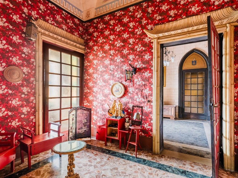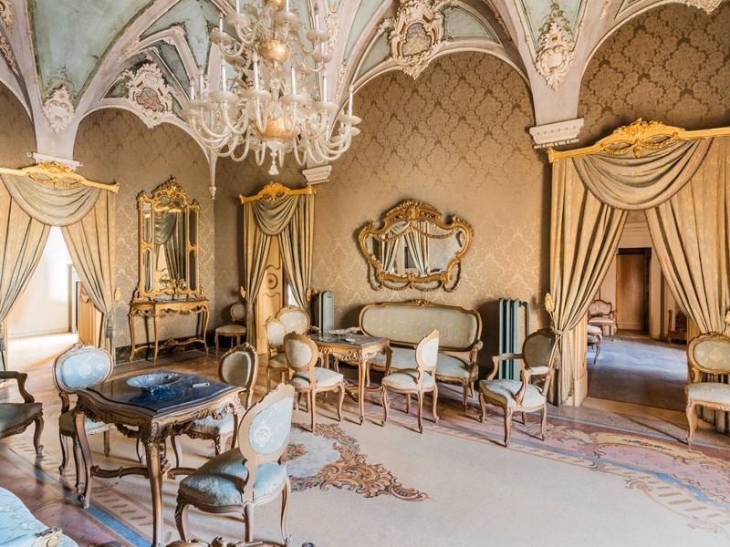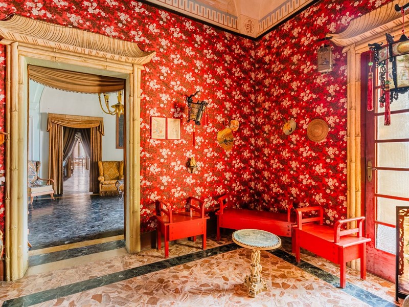 Tra le gemme artistiche più sorprendenti si trova una stanza decorata in stile chinoiserie, con affreschi che riproducono paesaggi orientali, motivi floreali delicati e figure esotiche dipinte con maestria, testimonianza del gusto cosmopolita e della raffinata sensibilità culturale della famiglia proprietaria dal fasto rococò del salone di rappresentanza, con i suoi stucchi raffinati, specchi dorati e tessuti preziosi per poi lasciarsi avvolgere dalle atmosfere solenni della camera barocca e dalleleganza austera della camera neogotica.
