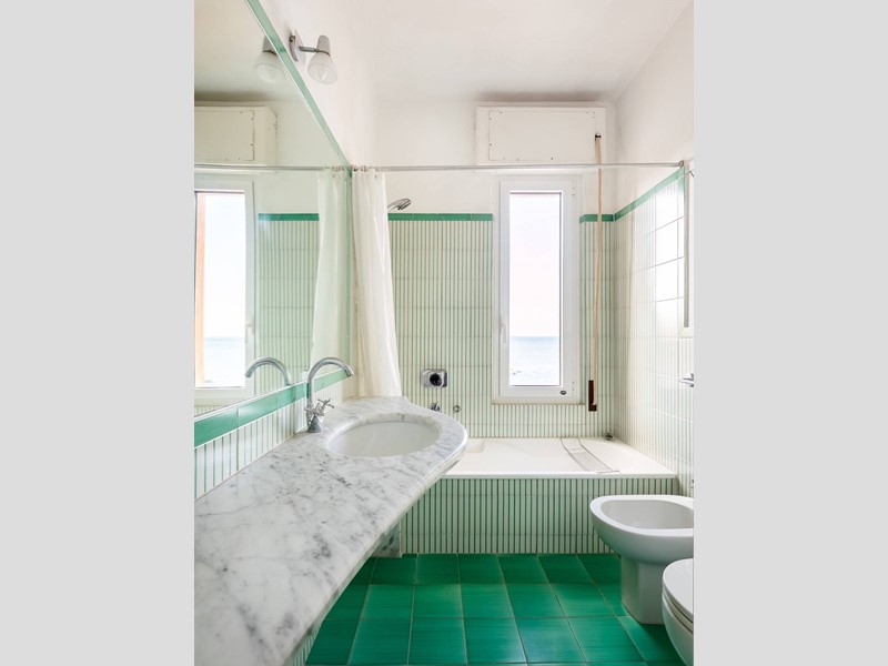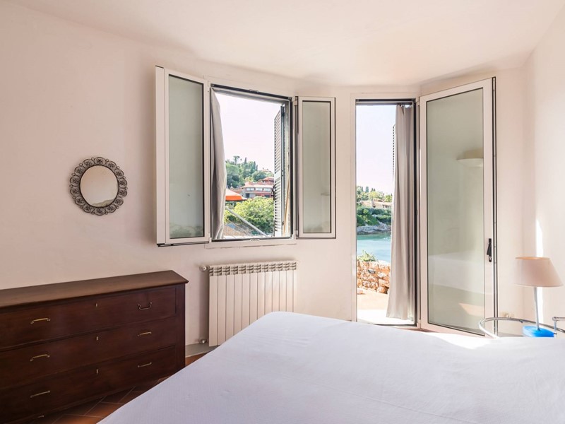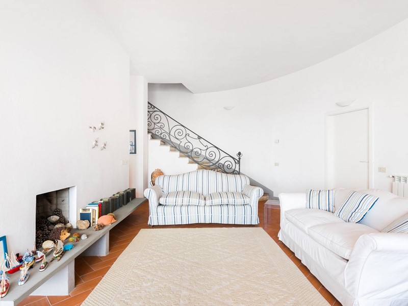 Al piano principale si sviluppa un ampio soggiorno impreziosito da grandi vetrate panoramiche che si aprono sul mare, creando una continuità naturale tra interno ed esterno. La cucina abitabile, funzionale e ben attrezzata, è affiancata da una zona di servizio composta da camera per il personale e lavanderia. Sullo stesso livello troviamo la camera padronale con bagno en suite, che gode di accesso diretto alla terrazza con vista mare.