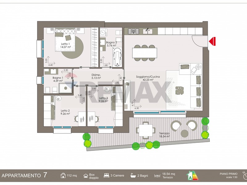 Dalla zona giorno e da una camera si accede allo splendido terrazzo coperto di circa 18,54 mq, uno spazio da vivere in ogni stagione, ideale per pranzi allaperto e momenti di relax.