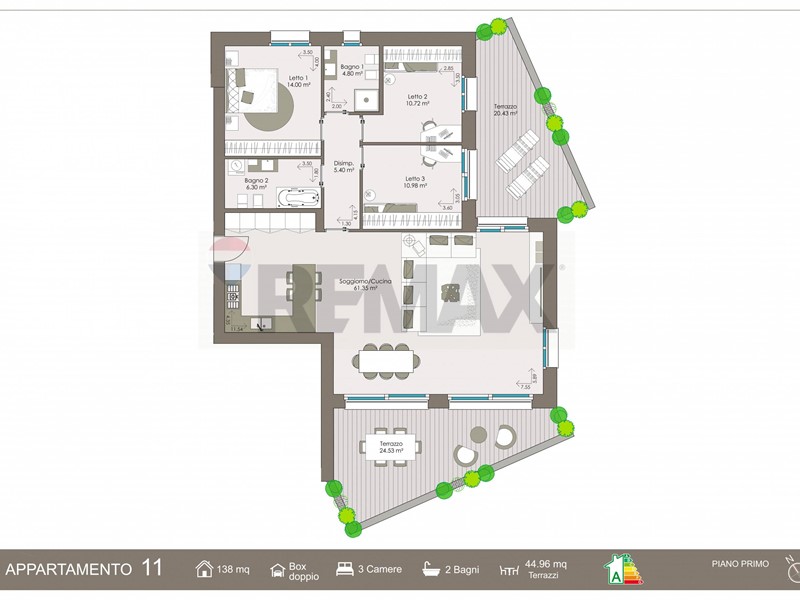 Dalla zona giorno e da due camere da letto si accede a due splendidi terrazzi coperti per un totale di circa 45 mq, spazi ideali per pranzi allaperto, relax e convivialità, perfettamente integrati con la casa.