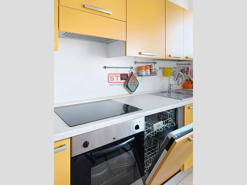 ingresso su luminoso soggiorno con angolo cottura, completo di fuochi a induzione e lavastoviglie, arredato in modo gradevole e funzionale