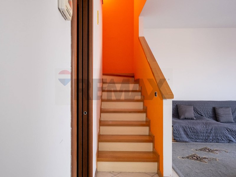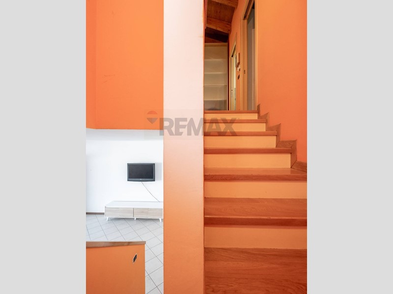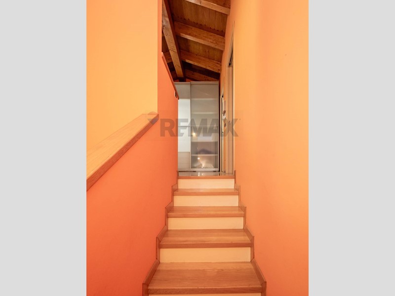 Una comoda scala interna conduce al piano superiore, dove il calore del parquet rende latmosfera ancora più accogliente.