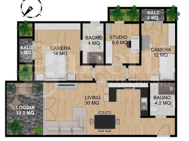 Esempio unità 3 - Piano Quarto - SLV 104 mq - Ingresso su ampio living con parete vetrata da cui si accede alla loggia di 10 mq, bagno/lavanderia, disimpegno notte, camera matrimoniale con bagno privato e balcone, studio/camera e camera doppia con ulteriore balcone. La stessa tipologia è disponibile anche al piano primo, secondo e terzo. Euro 350.000 oltre IVA. Volendo disponibilità di garage e posti auto. Consegna 2027.