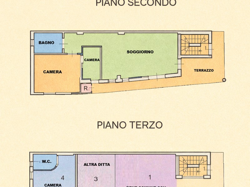 L'immobile è composto da ingresso sulla zona giorno con angolo cottura e caminetto, con accesso a un terrazzo a livello, due camere da letto e bagno. Al 3° piano è presente un terrazzo condominiale con una stanza privata adibita a monolocale con bagno, utilizzabile come piccola dependance, stanza multiuso o ripostiglio.