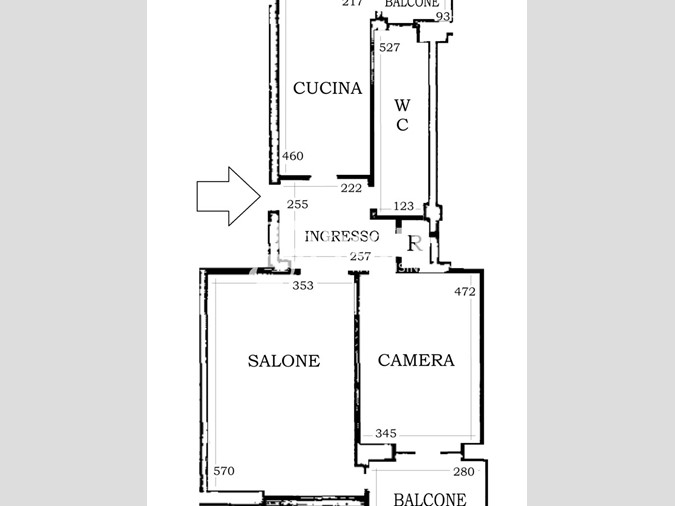 COMPOSIZIONE INTERNA: doppia esposizione est/ovest, ingresso, cucina abitabile, ampia sala, camera da letto, servizio, ripostiglio, due balconi (di cui uno ampio), completa la proprietà una cantina piastrellata al piano seminterrato;