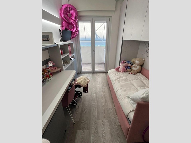 Ingresso su zona giorno con angolo cottura e balcone, Camera matrimoniale e Camera singola, entrambe con accesso al balcone, Due bagni con doccia e ripostiglio.