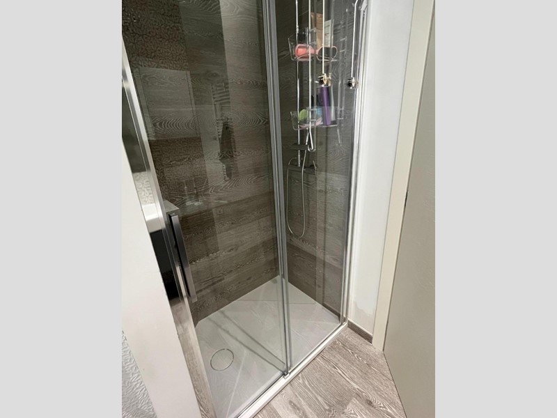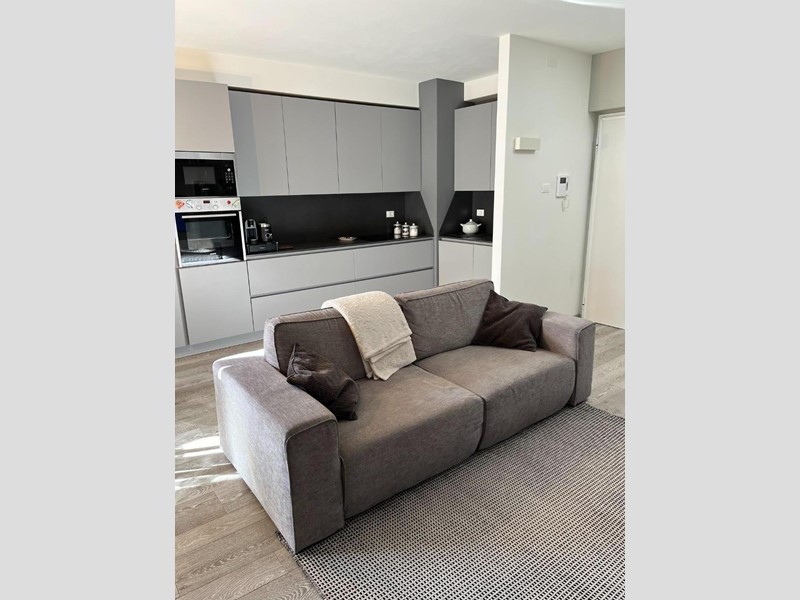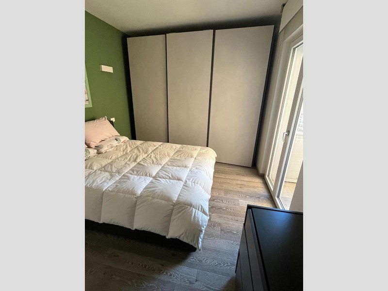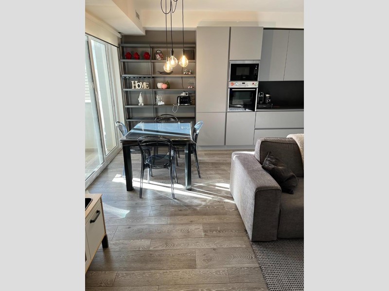 Ingresso su zona giorno con angolo cottura e balcone, Camera matrimoniale e Camera singola, entrambe con accesso al balcone, Due bagni con doccia e ripostiglio.