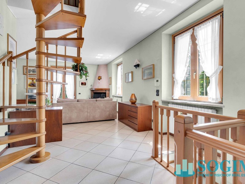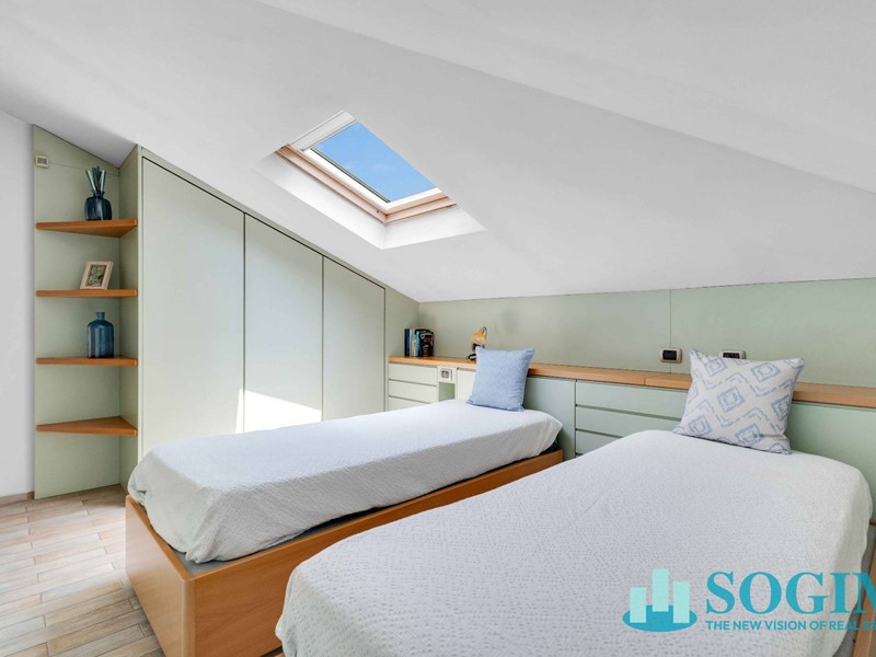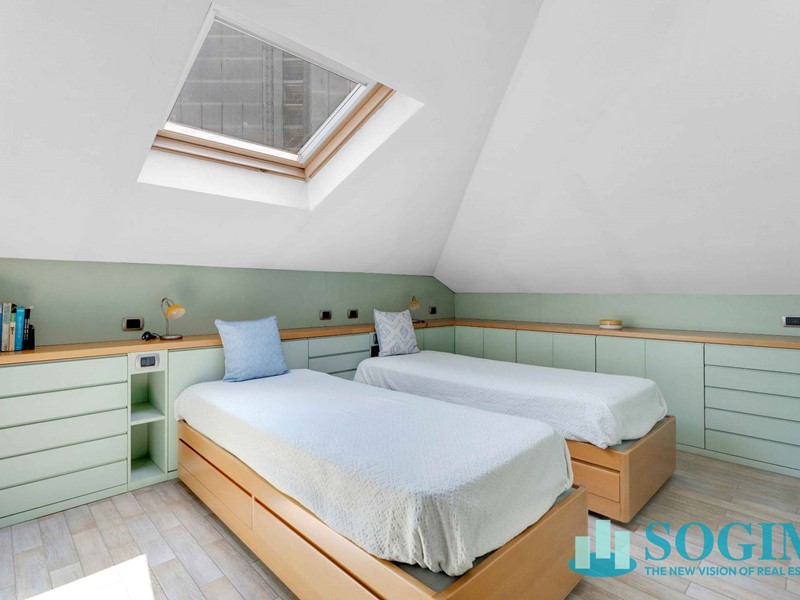 Una scala a chiocciola interna, in legno, conduce al piano superiore, con un disimpegno attrezzato con mobili contenitivi su misura, che dà accesso alla camera matrimoniale, ad una ampia cameretta e al secondo bagno.