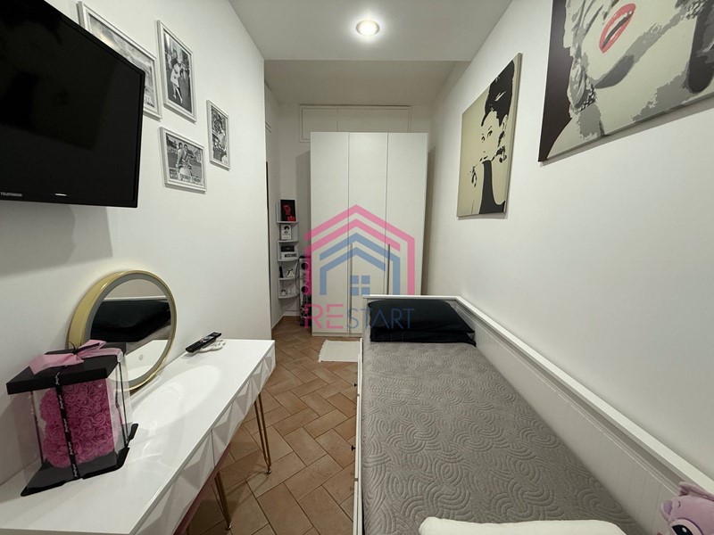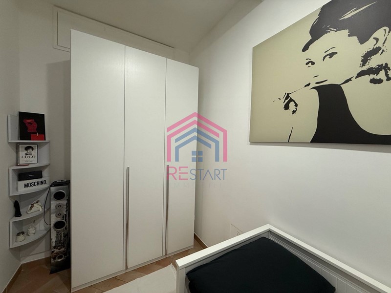 L'immobile ha una superficie totale di 85 metri quadrati circa, è composto da tre locali ed è così diviso: entrando ci accoglie un luminoso soggiorno con cucina a vista servita da una porta finestra che da accesso sul balcone perimetrale, proseguendo troviamo un ripostiglio, un piccolo corridoio con disimpegno che conduce alla zona notte, composta da cameretta, bagno finestrato con vasca e camera matrimoniale con accesso sul balcone.