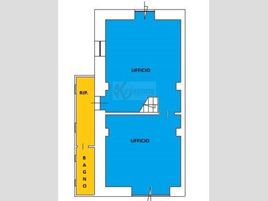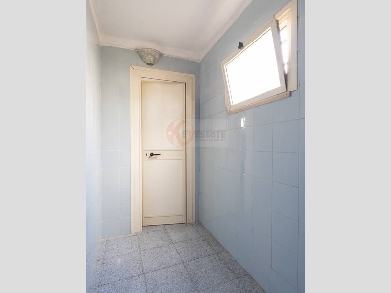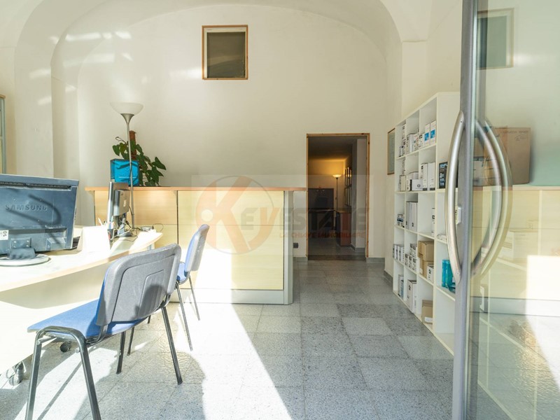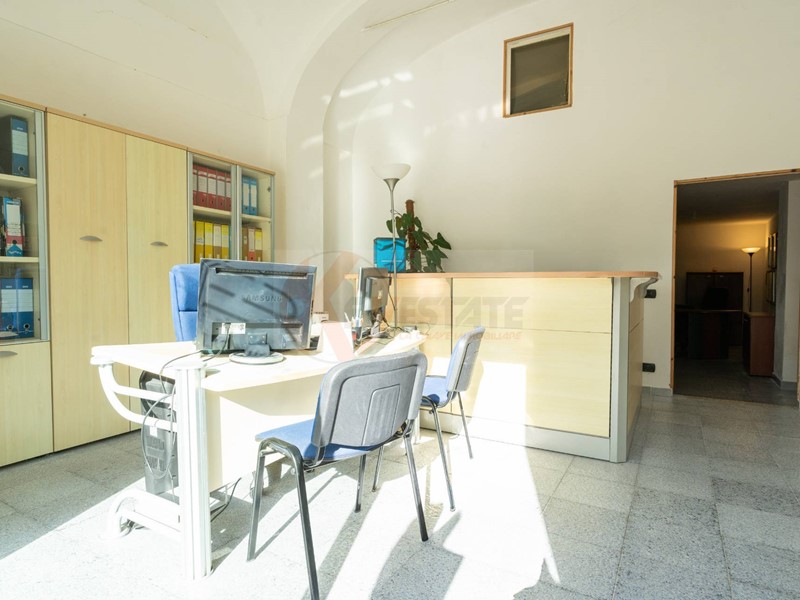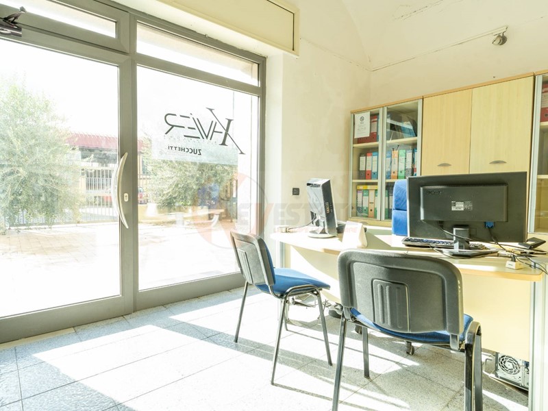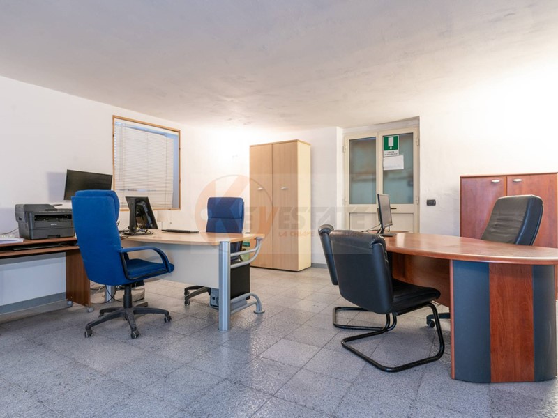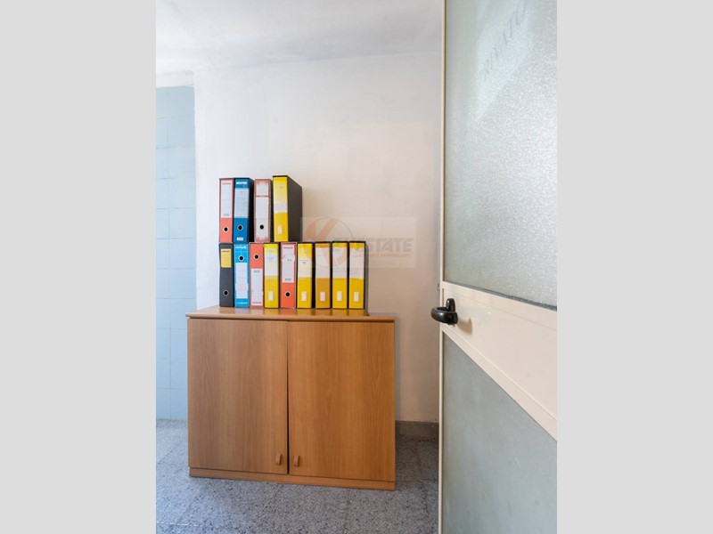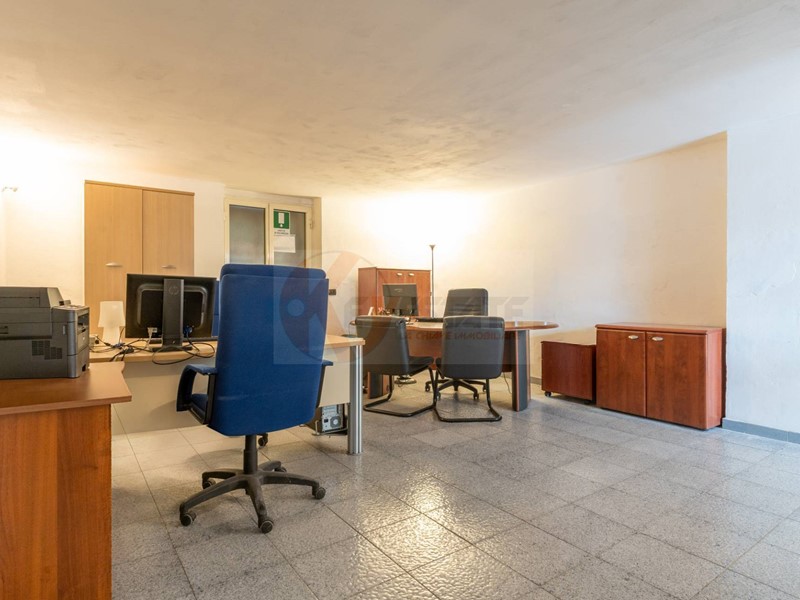 Il locale prosegue con un secondo ambiente regolare, oggi utilizzato come ufficio, in grado di ospitare comodamente due postazioni di lavoro con grandi scrivanie. Completano la proprietà un ampio antibagno, ideale anche come spazio deposito, e un bagno finestrato completo di servizi.