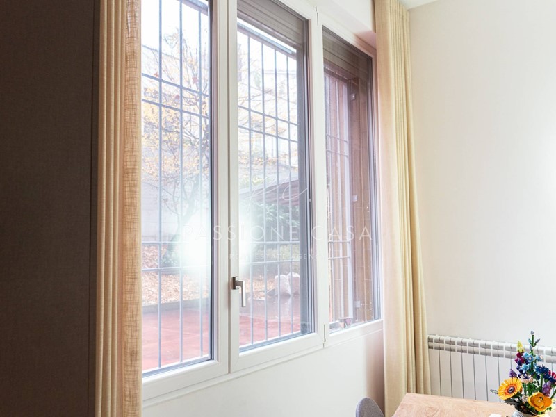 Pur essendo classificato come piano seminterrato, lappartamento gode di un affaccio aperto e non controterra: le grandi finestre a tutta altezza si affacciano sul silenzioso giardino condominiale interno, sfalsato rispetto al piano strada.