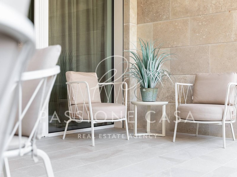 Soggiorno e cucina a vista già arredati con soluzioni di design, che si affacciano su un terrazzo vivibile, perfetto per momenti di relax o convivialità allaperto.