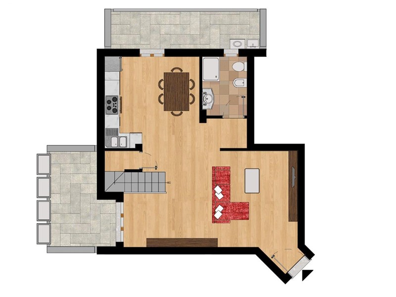 L’ingresso si apre su un ampio ambiente open space che accoglie la zona soggiorno, la cucina e la sala da pranzo, creando un’atmosfera moderna e funzionale, ideale sia per la vita quotidiana che per ricevere ospiti. La zona giorno è arricchita da due terrazzi abitabili, perfetti per pranzi all’aperto o momenti di relax. Completano il piano un antibagno, un bagno e un comodo ripostiglio.