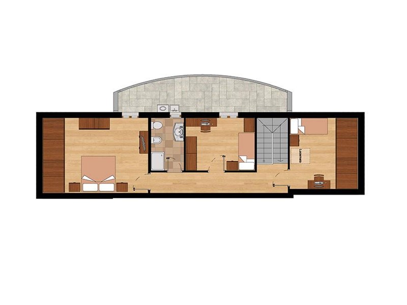 Salendo al livello superiore si accede alla zona notte, ben separata e riservata, composta da un disimpegno, una camera matrimoniale, due camere singole, un secondo bagno e un ulteriore terrazzo, che dona luce e ariosità anche a questo piano.