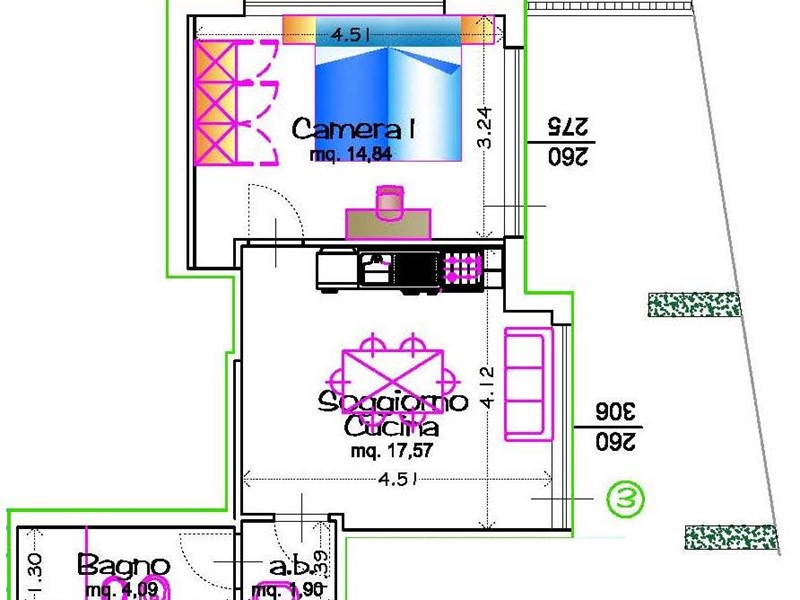 Composto da: ingresso su soggiorno con cucina a vista, una camera da letto matrimoniale, un bagno ad areazione forzata con cabina doccia.