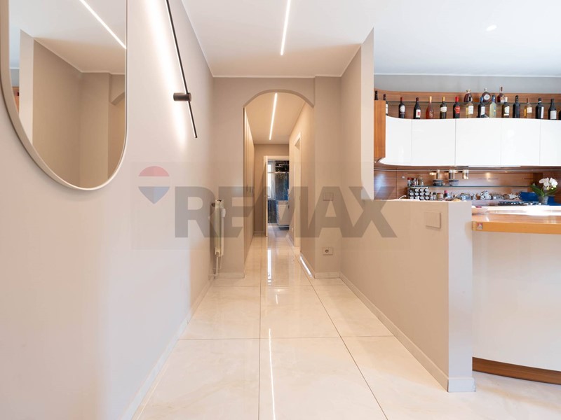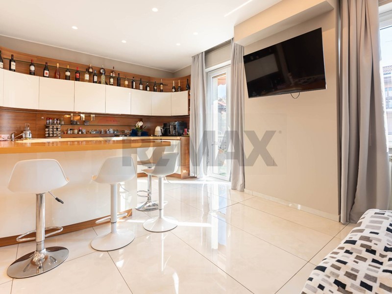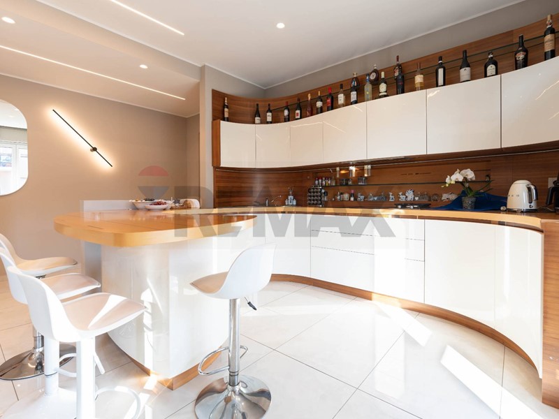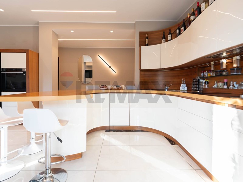 La cucina a vista è un vero capolavoro di design: è caratterizzata da linee curve e presenta un elegante contrasto tra i mobili bianchi laccati lucidi e i dettagli in legno noce. Perfetto per le serate con amici, un bancone penisola funge da punto d'incontro per colazioni veloci o aperitivi informali, completato da moderni sgabelli.