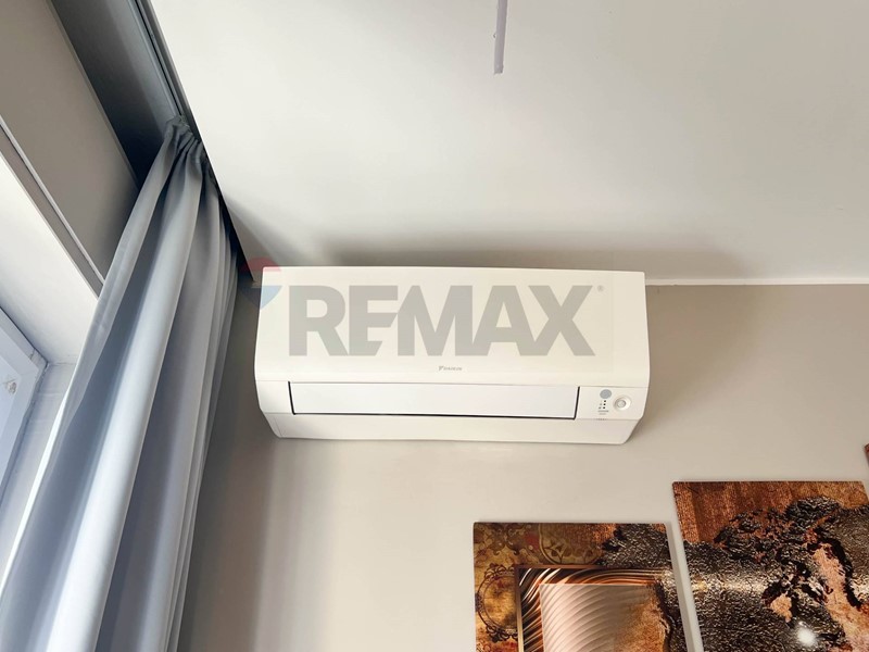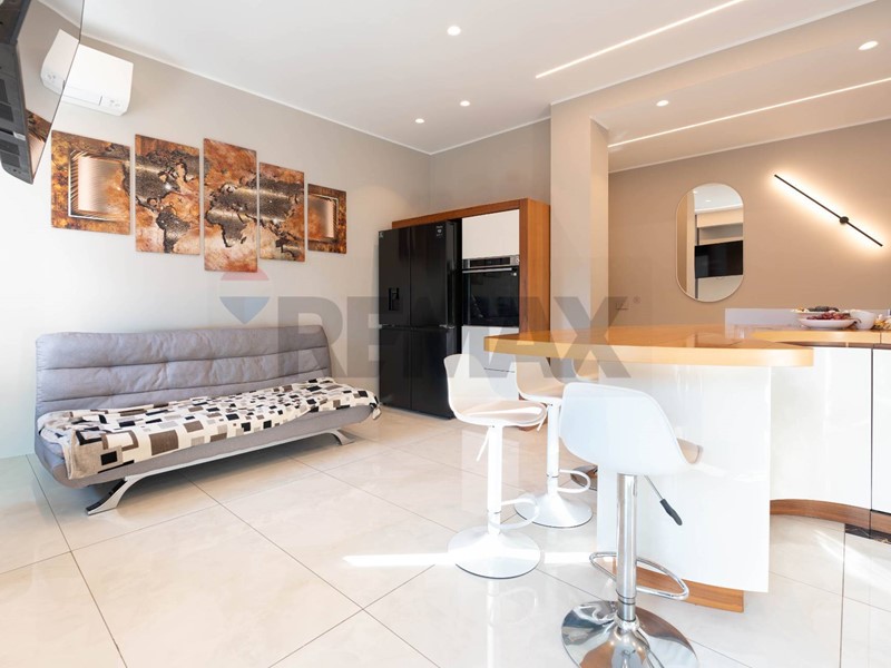 La zona living, pur essendo in continuità, offre un accogliente spazio relax servito dall'aria condizionata già installata. Da qui si accede direttamente al balcone/terrazzo, una piacevole estensione esterna per godersi momenti di tranquillità.