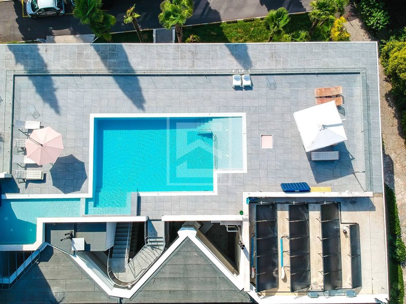 Piscina condominiale con vista lago sul tetto del condominio.