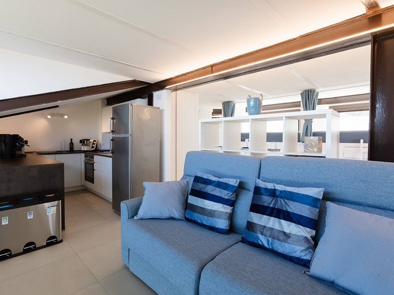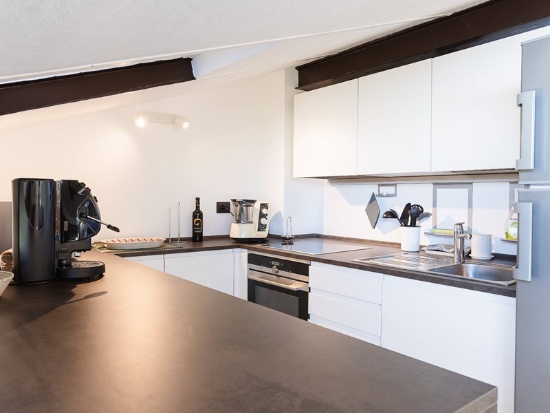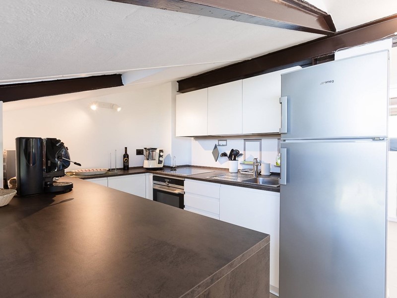 Il soggiorno, luminoso e accogliente, si apre direttamente sulla terrazza al piano, ideale per vivere lesterno in ogni momento della giornata. La cucina, moderna e funzionale, è perfettamente integrata nella zona giorno.