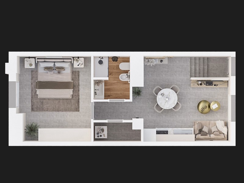 Gli appartamenti, completamente ristrutturati, sono dotati di ingresso indipendente da corte condominiale e grazie ad una piccola scala interna, si sviluppano al piano rialzato, garantendone una maggiore privacy e tranquillità. L'appartamento internamente è composto da ingresso su zona living con cucina a vista, ripostiglio, bagno non finestrato e una camera matrimoniale.