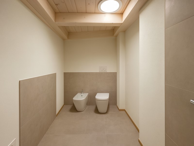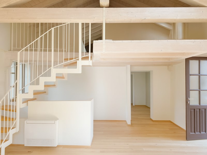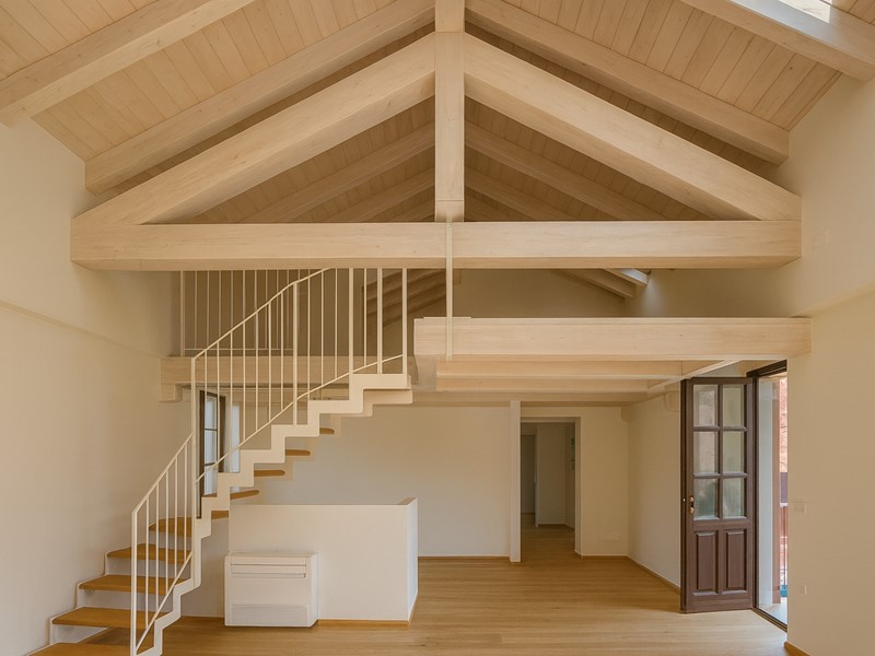 Al livello superiore, un elegante soppalco in legno che copre ¾ della superficie, ospita una seconda camera matrimoniale e un bagno aggiuntivo, creando uno spazio intimo e versatile.