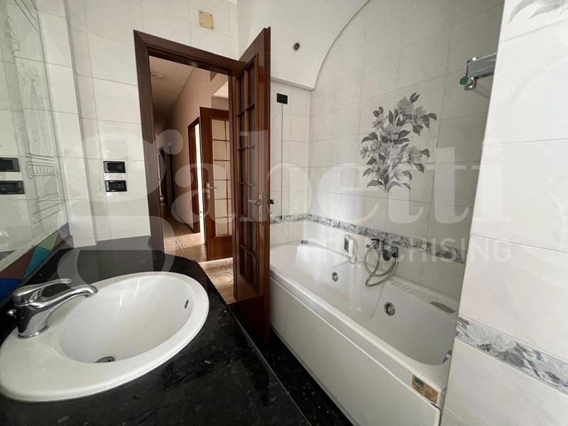 La casa ha un comodo ingresso, primo ripostiglio, salone doppio (con due porte finestra verso il grande balcone), lungo corridoio, cucina abitabile con accesso alla veranda chiusa con ripostiglio esterno (secondo ripostiglio), camera matrimoniale con accesso al grande balcone, camera da letto con accesso al balcone (comune alla camera matrimoniale), bagno con vasca e finestra, doppio servizio con doccia e finestra e spazio lavanderia.