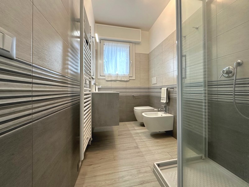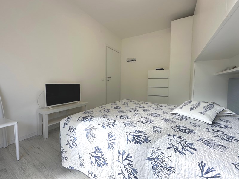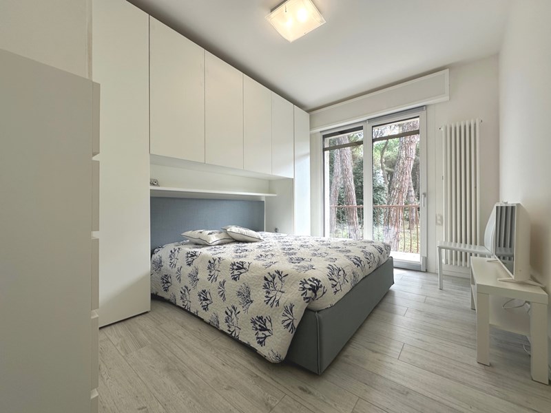 L'unità immobiliare oggetto della presente proposta è situata al piano rialzato con accesso indipendente e si compone di zona giorno con divano letto ed angolo cottura con lavastoviglie e lavatrice, terrazzo orientato a ovest con tenda da sole, disimpegno, camera con letto matrimoniale e antistante terrazzo con vista panoramica sulla pineta in lato ovest, camera con letto singolo e letto estraibile, bagno finestrato con box doccia. All’unità immobiliare è abbinato un posto auto privato all’interno dell’autorimessa situata al piano seminterrato.