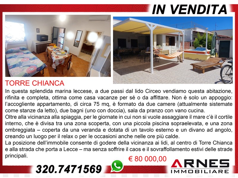 TORRE CHIANCA – In questa splendida marina leccese, a due passi dal lido Circeo – il più importante dell’abitato – vendiamo questa abitazione, rifinita e completa, ottima come casa vacanze per sé o da affittare. Non è solo un appoggio: l’accogliente appartamento, di circa 75 mq, è formato da due camere (attualmente sistemate come stanze da letto, una con matrimoniale e l’altra con due letti), due bagni (uno con doccia), sala da pranzo con vano cucina.