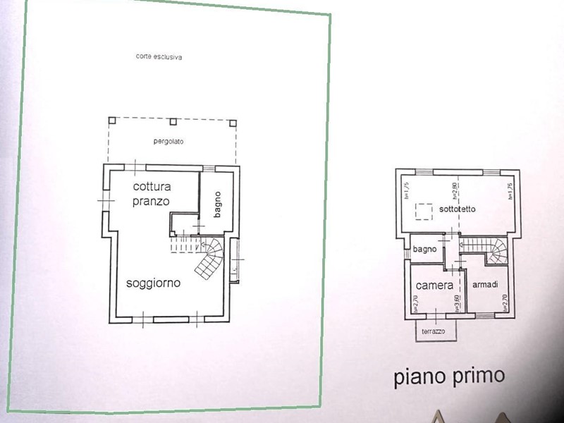 -Piano Primo: Due camere di cui una con terrazzo, un bagno, ampio vano sottotetto attualmente sfruttato come terza camera e possibilità di realizzare ulteriore bagno nella camera padronale;