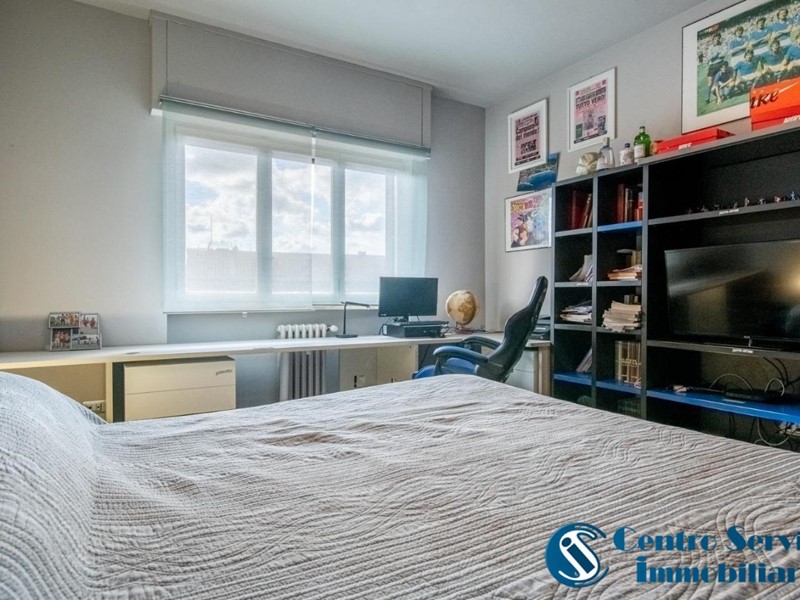 La zona notte ospita due spaziose camere matrimoniali e doppi servizi finestrati, uno con vasca e uno con doccia, oltre a disimpegno con ripostiglio e armadiature.