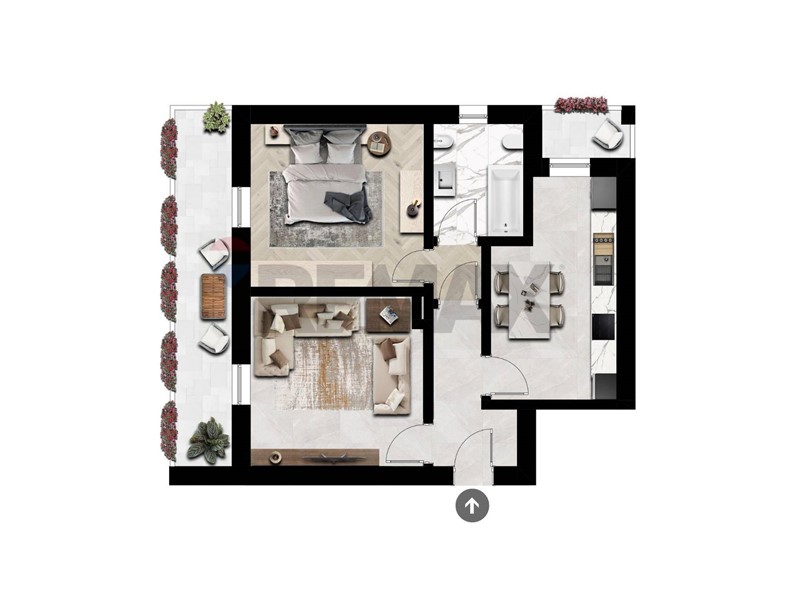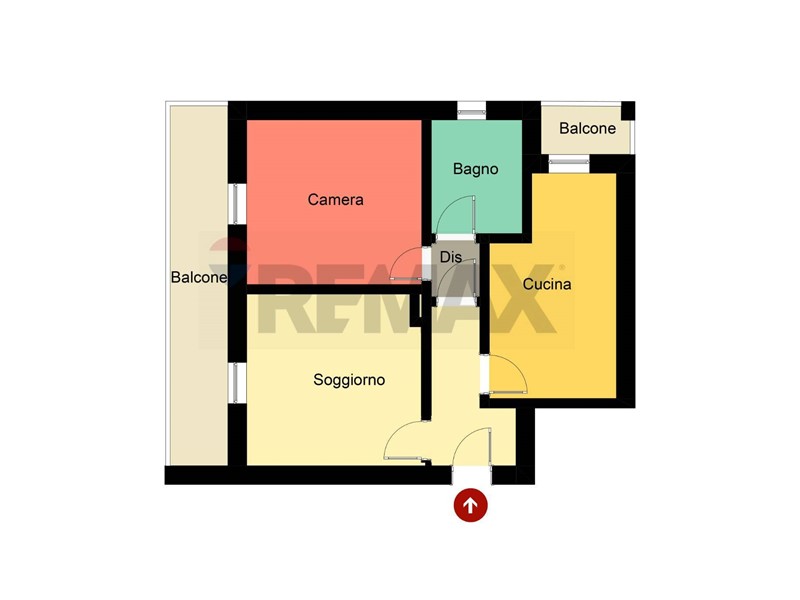Lappartamento è così composto: ingresso, soggiorno con balcone, disimpegno, bagno, cucina abitabile con balcone di servizio e camera matrimoniale.