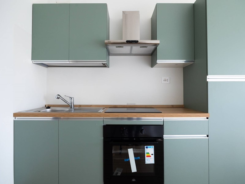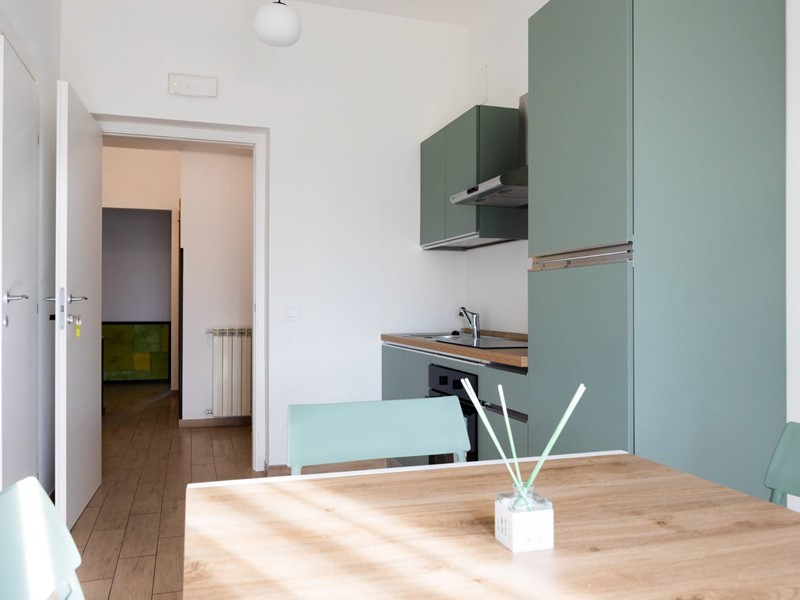 Cucina abitabile con bagno e accesso diretto al balcone, ideale come area colazioni o spazio comune per gli ospiti